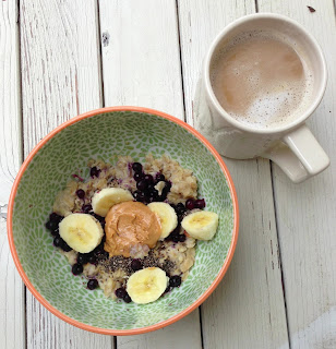 Breakfast was my (gluten free) banana sweetened oatmeal made with unsweetened vanilla almond milk and topped with chia seeds, organic blueberries, banana and a tablespoon of organic peanut butter. With a mug of my precious coffee and almond milk.