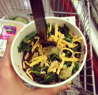 I had my dinner while picking up some groceries at Whole Foods. Quinoa, black beans, kale, organic chicken, cheese and green salsa.