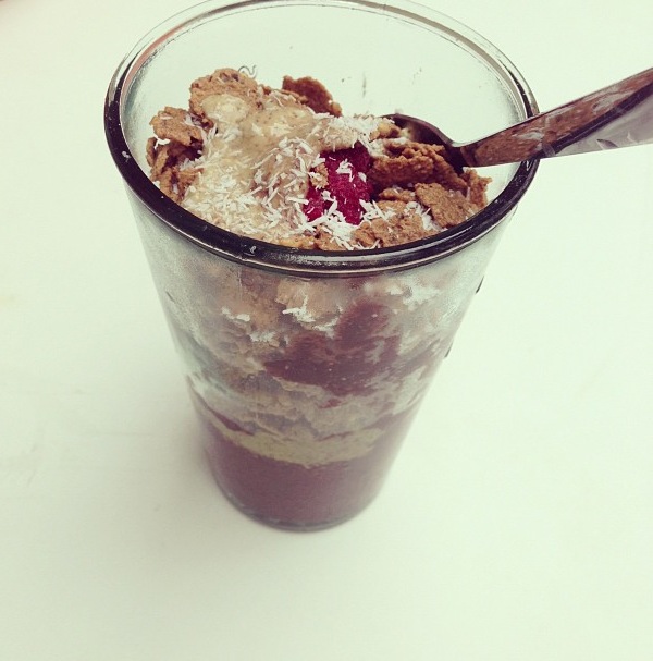 For breakfast I had Acai (you can see my Acai bowl recipe here) blended with coconut water and organic blueberries, topped with 1 cup of Erewhon Buckwheat & Hemp cereal, 1 tbsp of chia seeds, and 1 tbsp of almond butter.